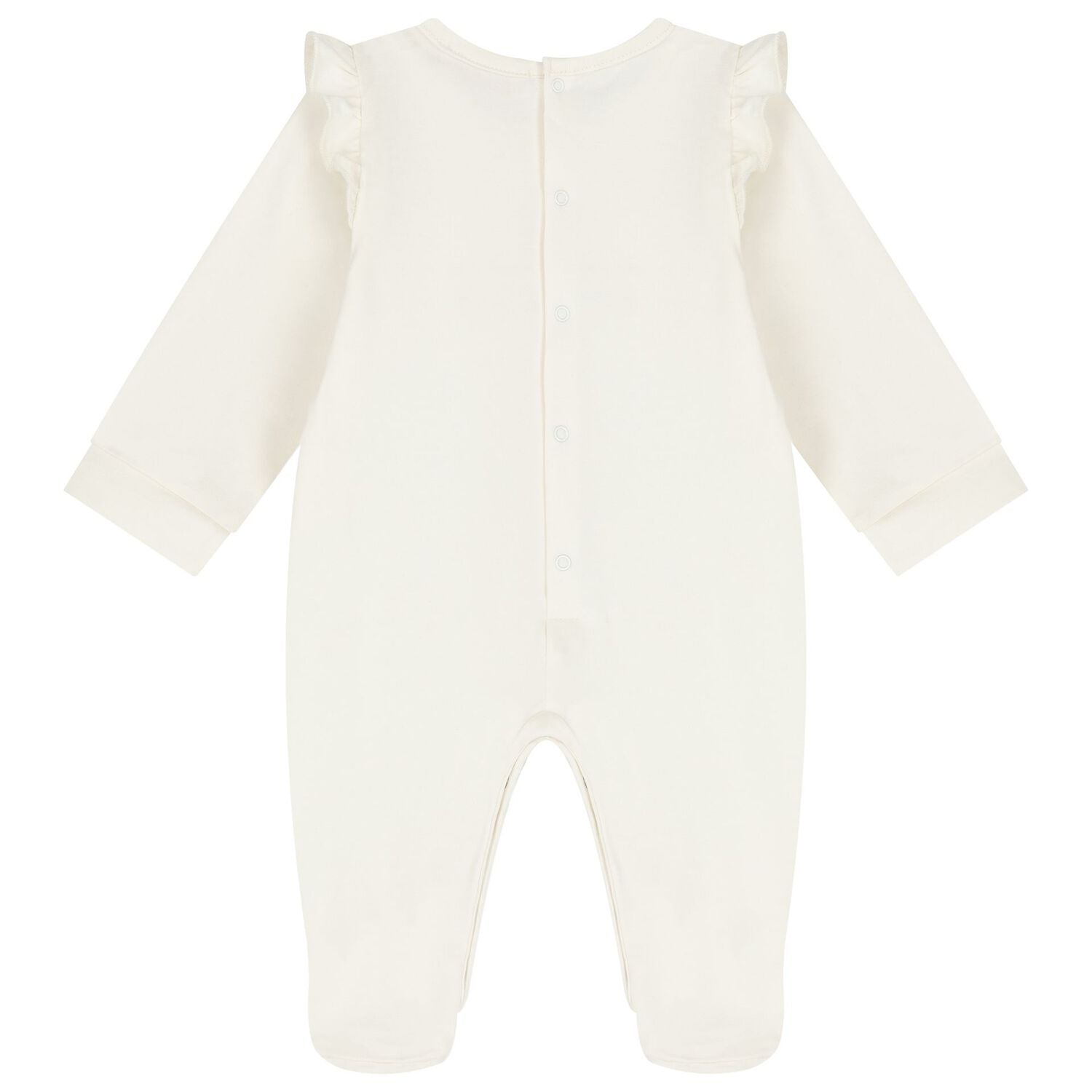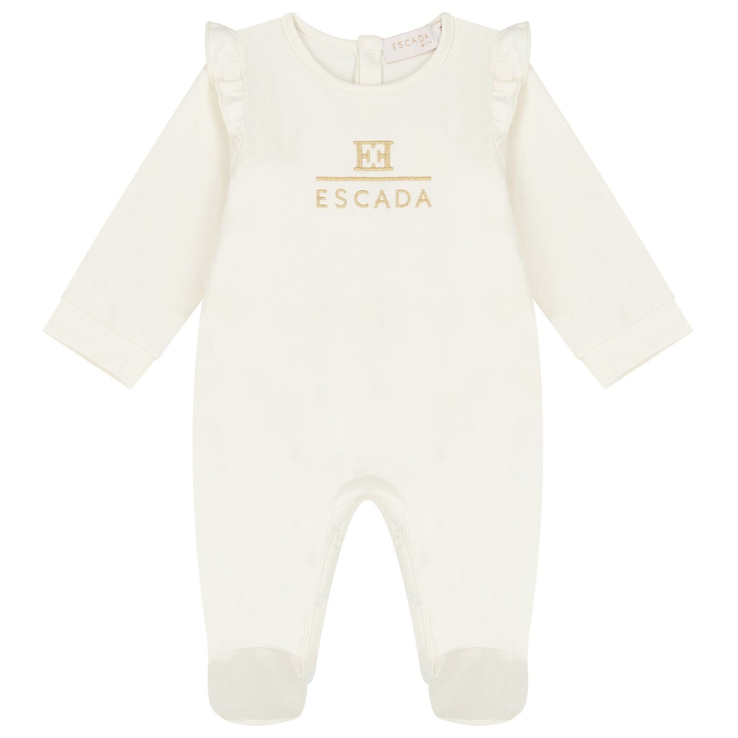 Strampler von Escada aus weichem Baumwolljersey mit Rüschen an den Schultern und ein besticktes Logo auf der Vorderseite in Gold.