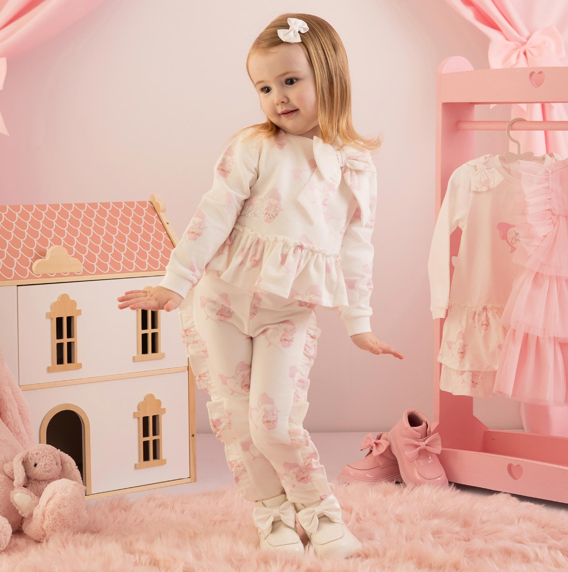 Oberteil mit Rüschensaum und einer süßen Schleifenapplikation am Hals kombiniert mit der passenden Hose mit Rüschen.