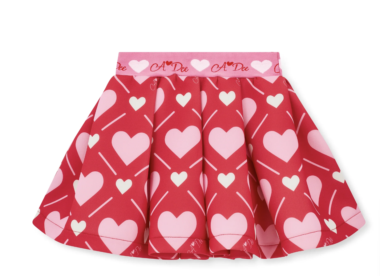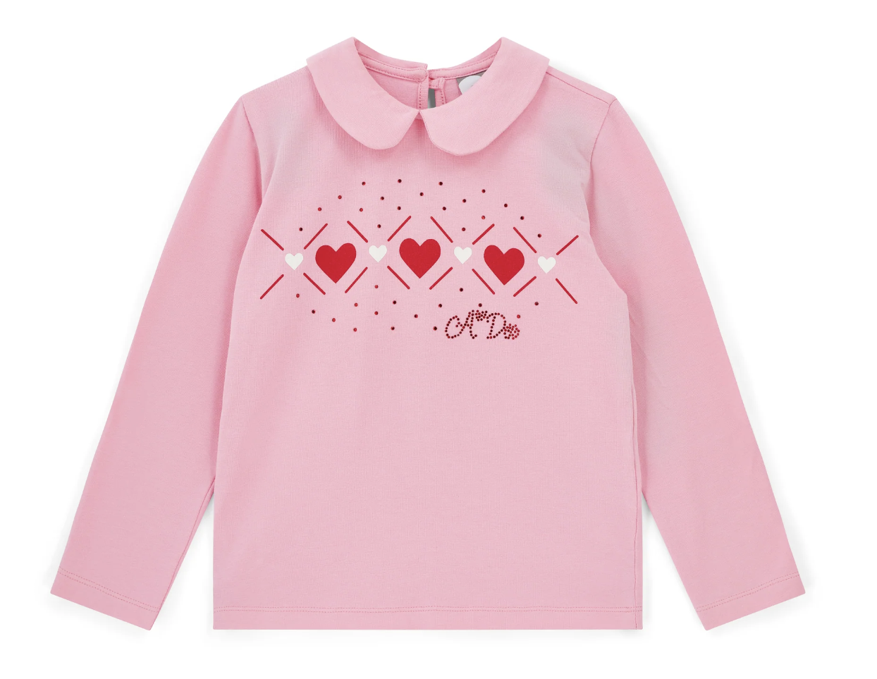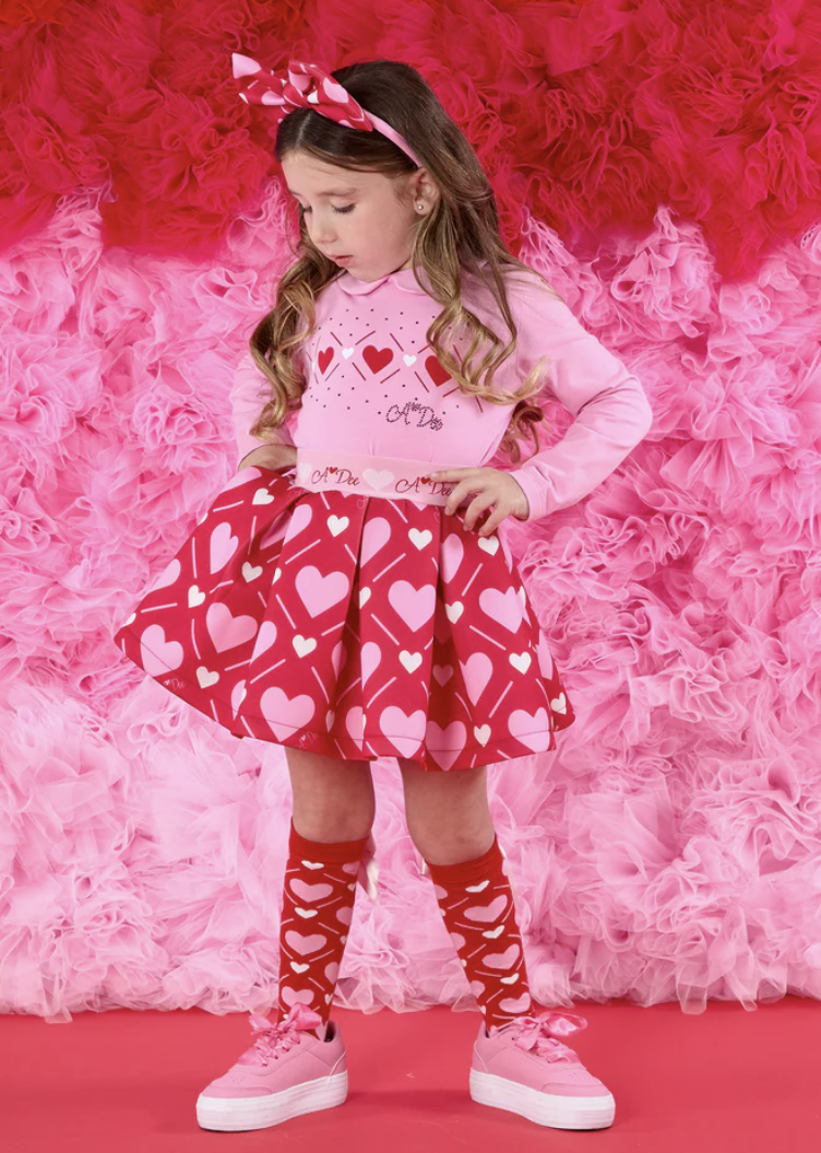 Rock mit Herzmuster kombiniert mit einem langärmeligen Oberteil mit Kragen, Herzen und Steine
