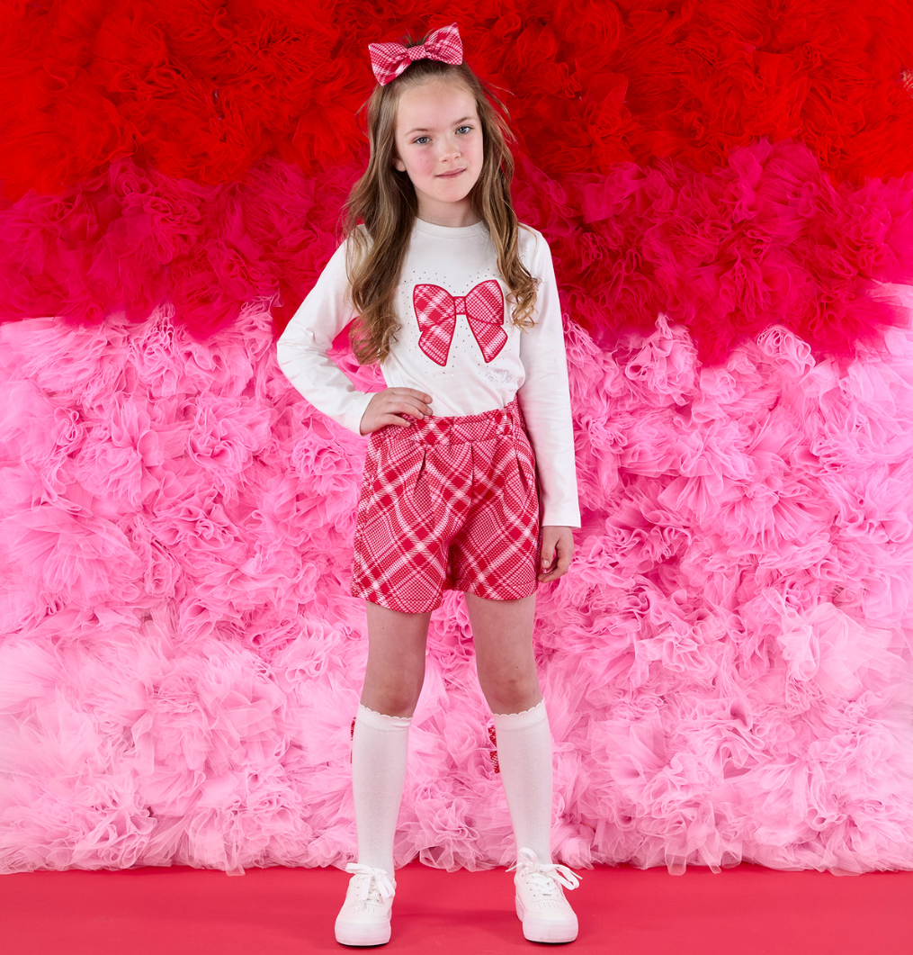 Zweiteiliges Set: Shorts mit bedrucktem Karomuster und weißes Jersey-Top