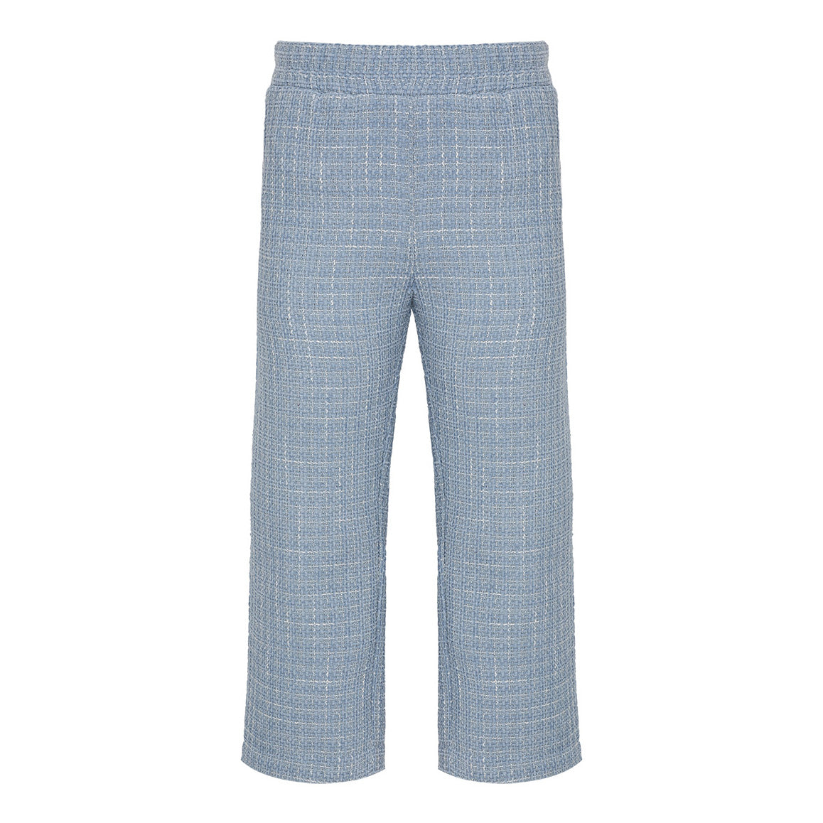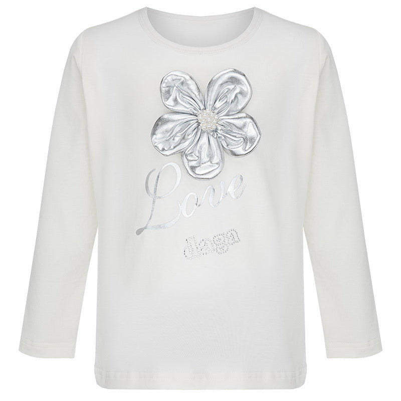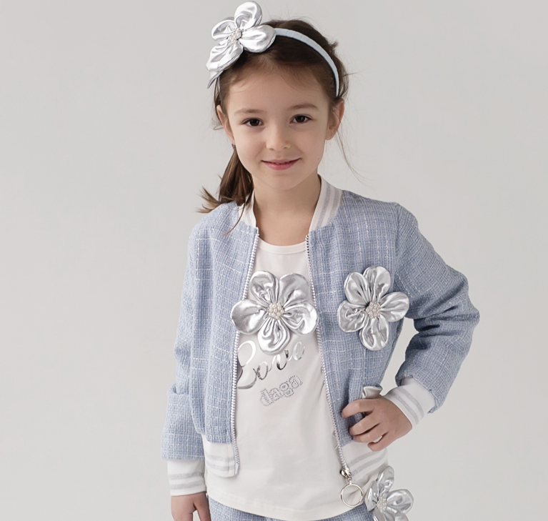 Jersey-Top mit langen Armen und wunderschöner Applikation mit silberner Stoffblumendekoration, Jacke aus gewebtem blauem Stoff mit großer silberner Applikation Blume mit einer passenden Hose aus gewebtem blauem Stoff