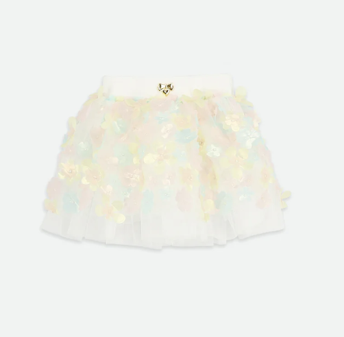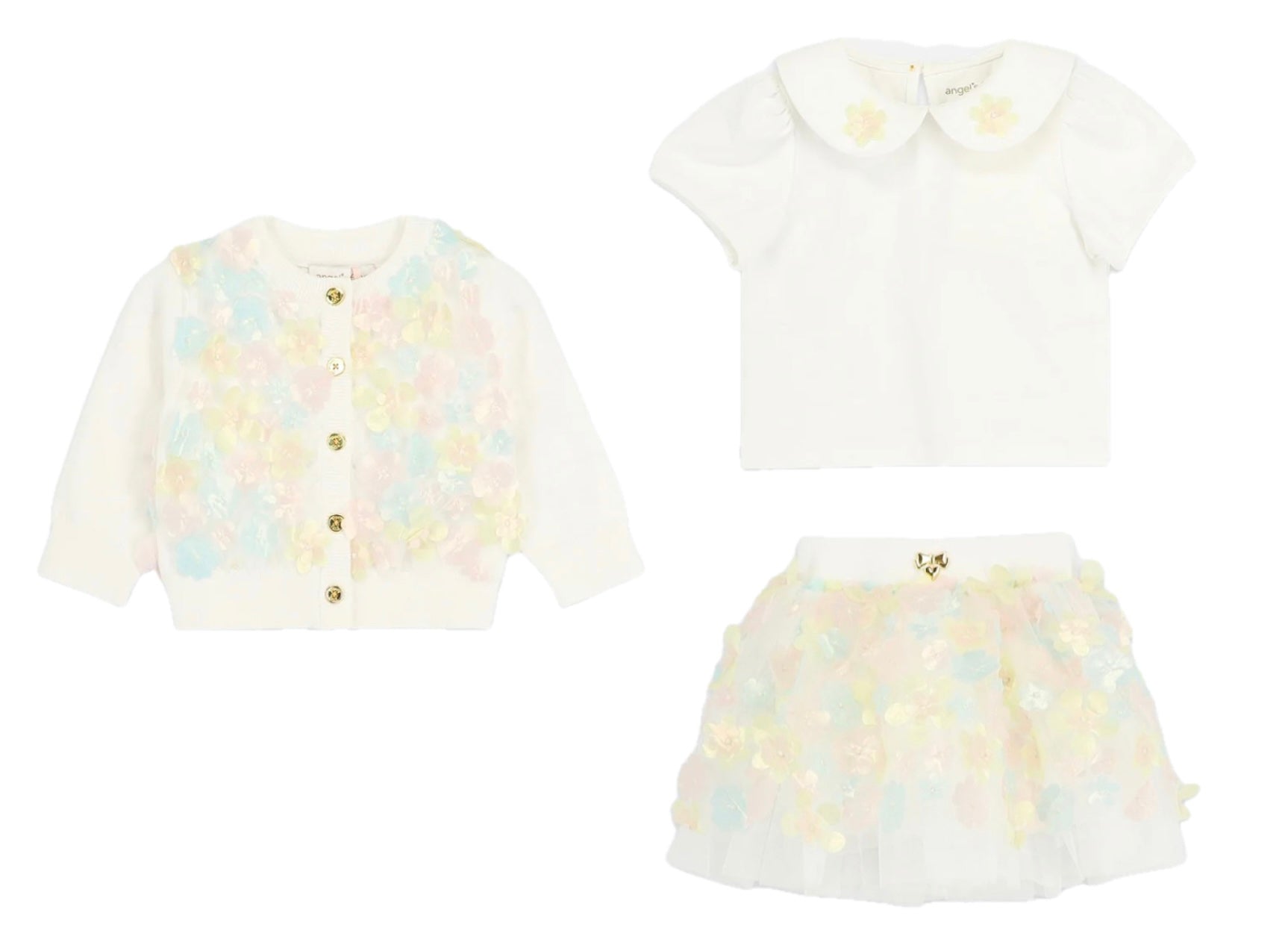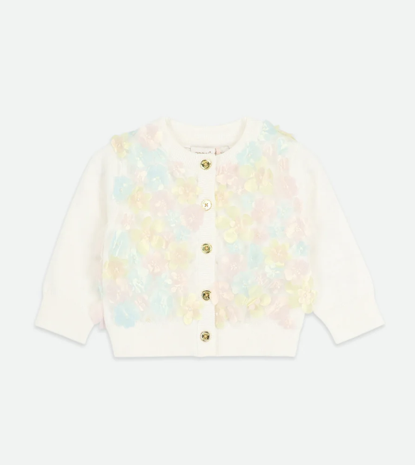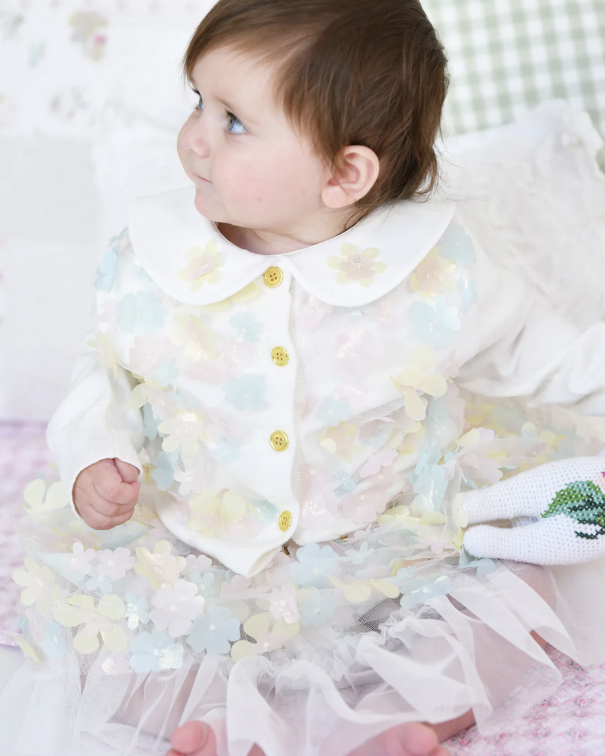 Hübsche Strickjacke in zartem Weiß mit feinen Pastelldetails und wunderschönen 3D-Blütenapplikationen. Dazu ein passender Rock mit hübschen pastellfarbenen 3D-Blumenapplikationen und einem bequemen Gummibund sowie ein Oberteil mit abgerundetem Peter-Pan-Kragen, das mit dezenten Blumenapplikationen verziert ist.
