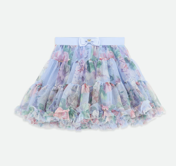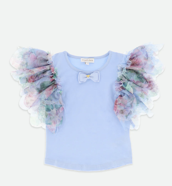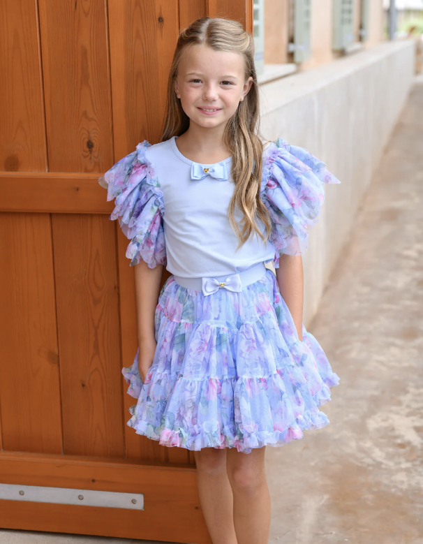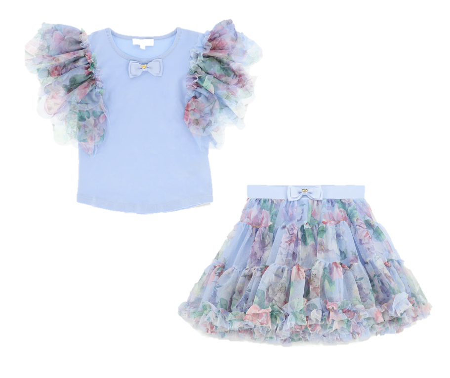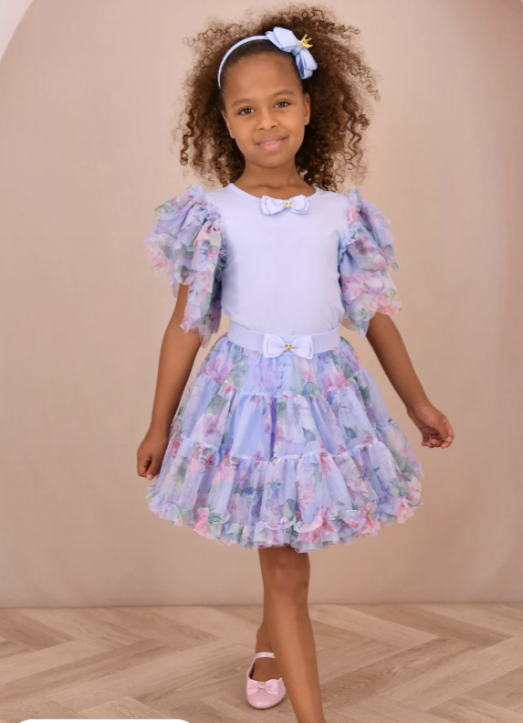Sommer-T-Shirt in hübschem Blau mit Ärmeln aus Tüll mit Blumenmuster und ein Tutu mit Blumenmuster aus mehreren Lagen weichem Tüll.