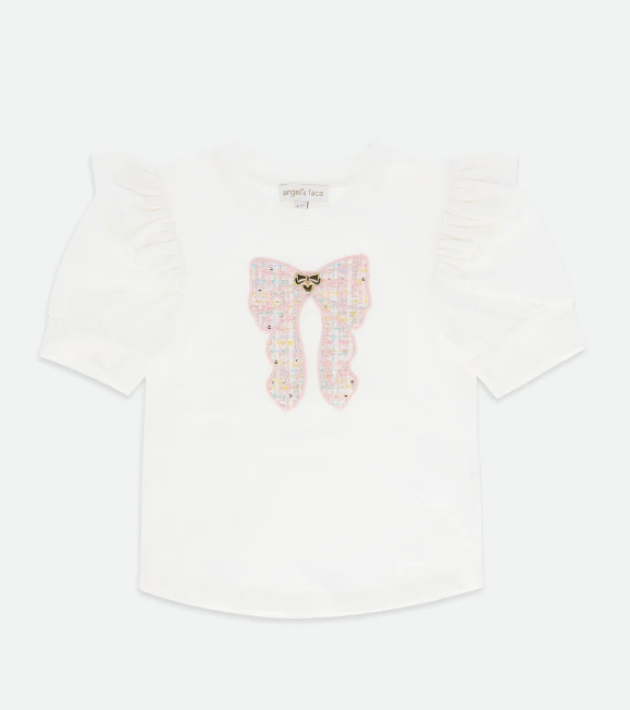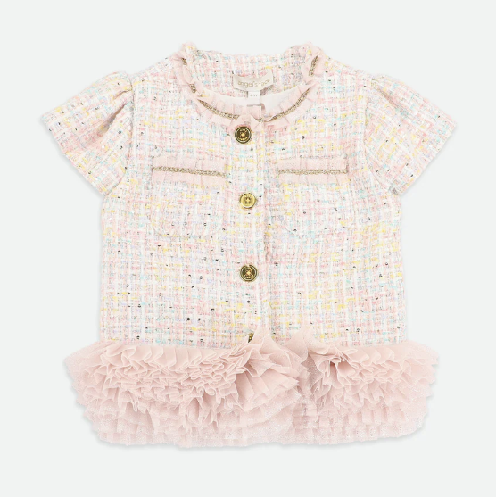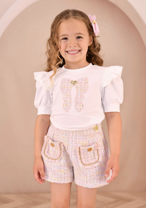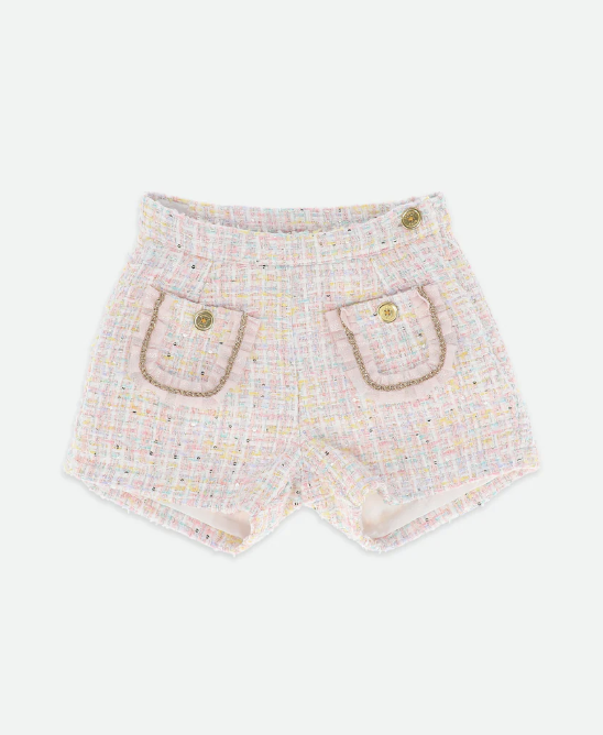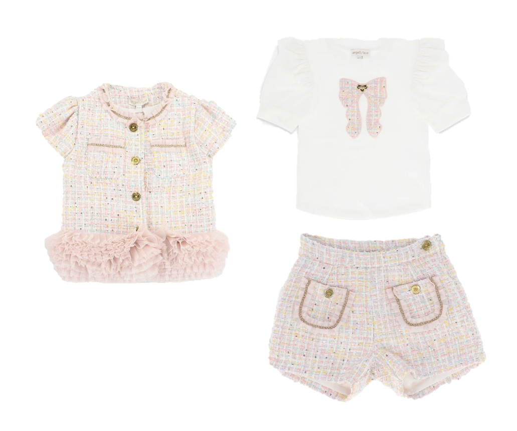 Das Oberteil hat eine zarte Rüschenverzierung an den Schultern und eine auffällige Schleife aus Tweed auf der Vorderseite. Die rosafarbene Jacke ist aus weichem Pastelltweed mit dezentem Glitzer gefertigt. Dazu passende rosa Tweed-Shorts.