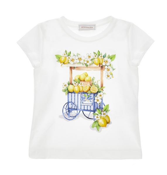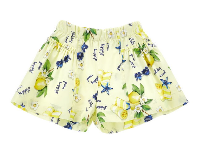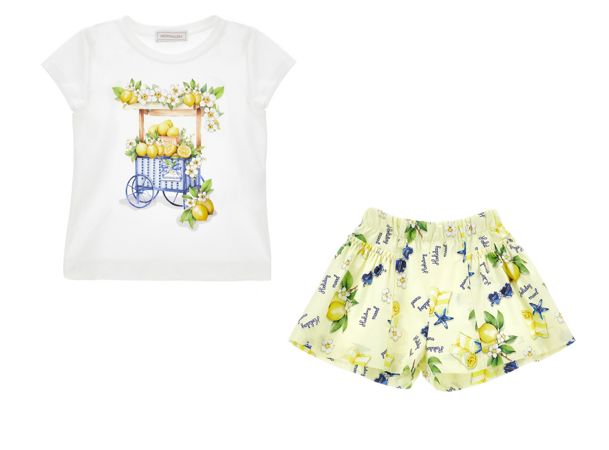 weiße Baumwoll-T-Shirt aus weichem Jersey mit Abbildung eines Wagens mit leuchtend gelben Zitronen und Baumwollshorts mit Sommerurlaubsdesign wie Zitronen, Strandtüchern und Sonnenbrillen gemustert
